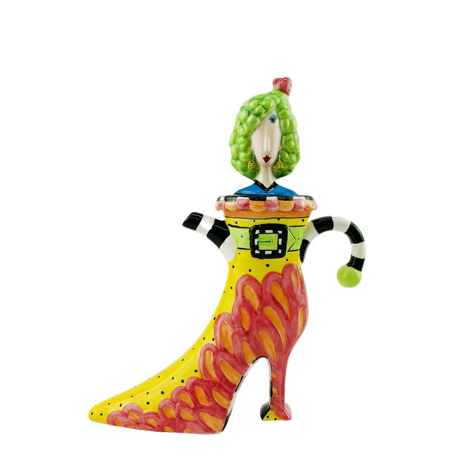 Introducing the whimsical Cosmos Gifts Dollymama Shoe Teapot, a charming and quirky teapot designed for your solo tea indulgence. This teapot is a delightful fusion of artistry and functionality, where the ladies' head gracefully transforms into a removable lid, adding a touch of playfulness to your tea experience.