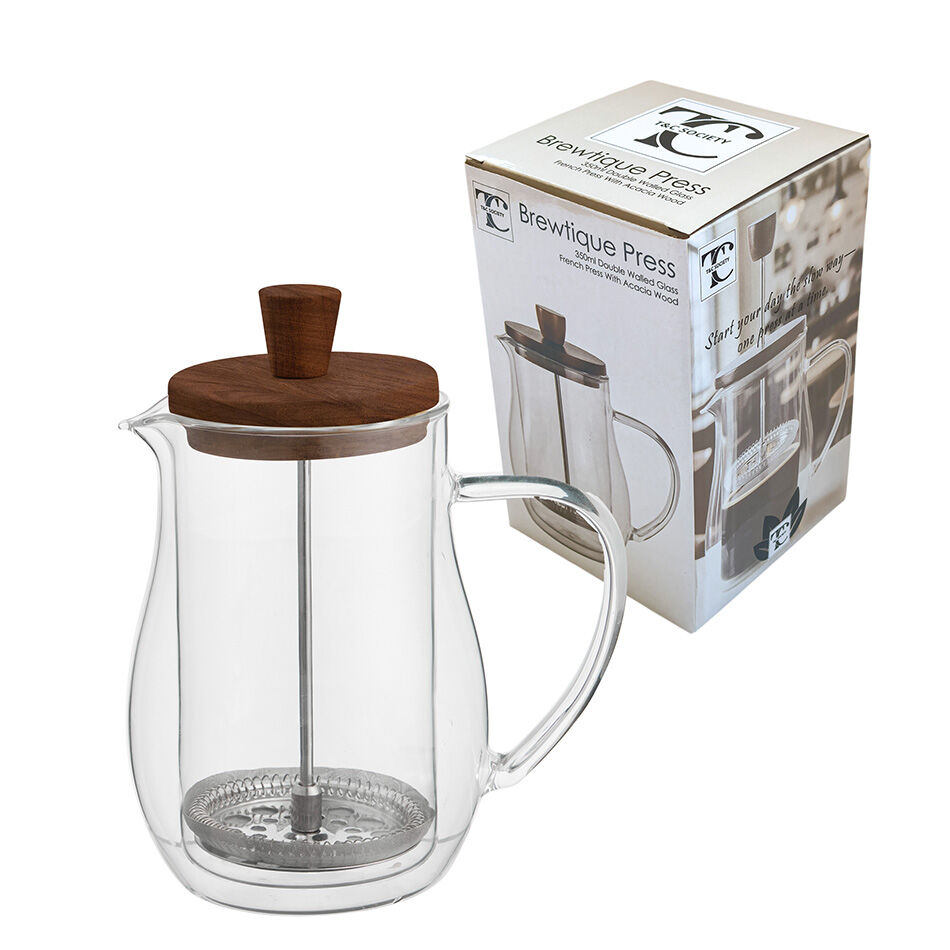 Featuring a sleek acacia wood lid with a matching knob, stainless steel press filter, and a curved glass body and handle.