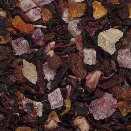 A blend of dried fruit pieces: Currants, Hibiscus, Pineapple bits, Rosehip shells, Flavour