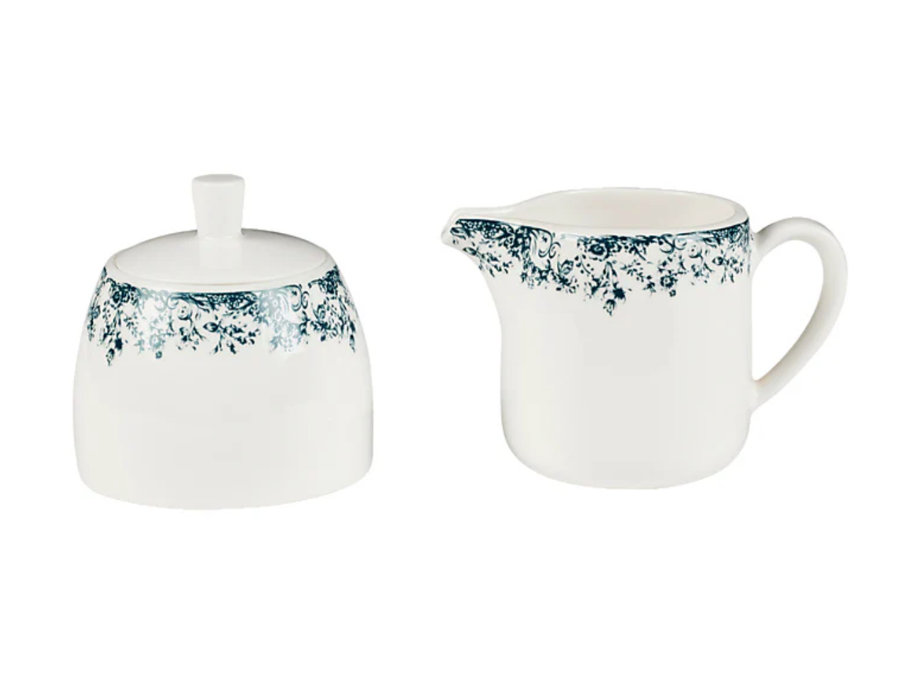 A timeless Sugar and Creamer set, featuring delicate hand-painted rose and vine detailing around the rim. Designed to add a gentle and classic touch to everyday tea or coffee moments.