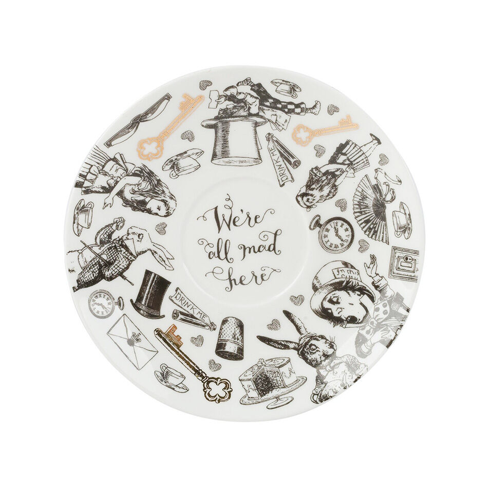The cup and saucer are printed with black-and-white illustrations, displaying a scene of Alice at the Hatter's tea party. The designs are inspired by an Alice in Wonderland card game based on artwork by Sir John Tenniel (1820 - 1914).