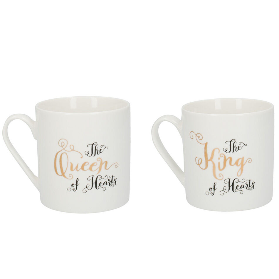 These mugs are decorated with black and white illustrations of the fiery Queen of Hearts and the timid King of Hearts. The fearsome character points angrily at the Queen mug, while her famous words, ‘Off with their heads!’ line on the inside rim. On the second mug, the King looks on, while his phrase ‘Don’t be impertinent’ is featured inside.