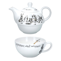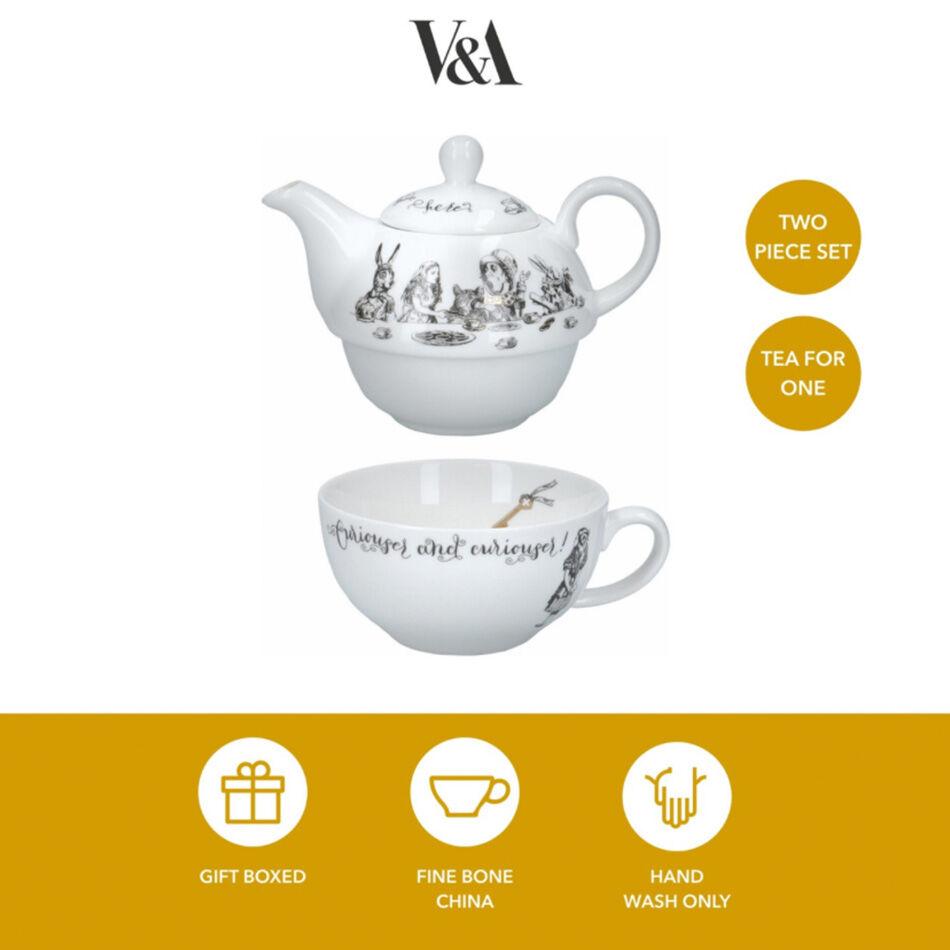 Whether you’re making your first brew of the day or putting your feet up for a well-earned rest, this V&A Alice in Wonderland Tea for One teapot and cup set has all you need to sit back and relax. The miniature fine china tea pot stacks neatly inside the wide-rimmed tea cup, creating a set that’s as cute as it is compact. Scenes of the Mad Hatter’s tea party decorate the sides. These are inspired by Alice playing cards, based on illustrations by Sir John Tenniel (1820 - 1914). The words ‘curiouser and curiouser!’ adorn the teacup in an eye-catching, loopy font, while the Hatter’s famous quote ‘we’re all mad here’ decorates the lid. Each piece is beautifully finished with shimmering gold detail.
